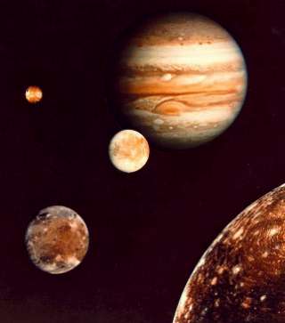 | A closer view of Saturn, showing its rings (with the Cassini division), the bright equatorial banding and two small moons. A rare "white spot" can be seen part-way to the pole. | The giant planet, Jupiter, with its Great Red Spot and a few of its moons (volcanic Io and icy Europa in the middle ground): Voyager, 1979. |