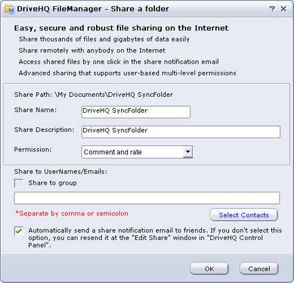 Share to UseNames/Emails: Enter the your friends available email addresses. You can select it from address book by clicking Select Contacts. Multiple email addresses can be entered ( separated by a comma or semicolon). If you know your friend's DriveHQ Username, then you can use it instead of the email address.