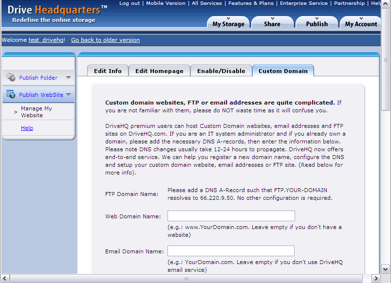 - DriveHQ provides advanced features for business website hosting. You can specify your own WWW domain name and email domain name in the Custom Domain page. For more detail info, please see the following section.