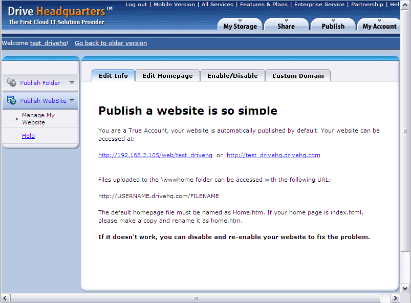 If you have a paid account, your website is automatically published. You can access your website in DriveHQ at: https://USERNAME.firstcloudit.com