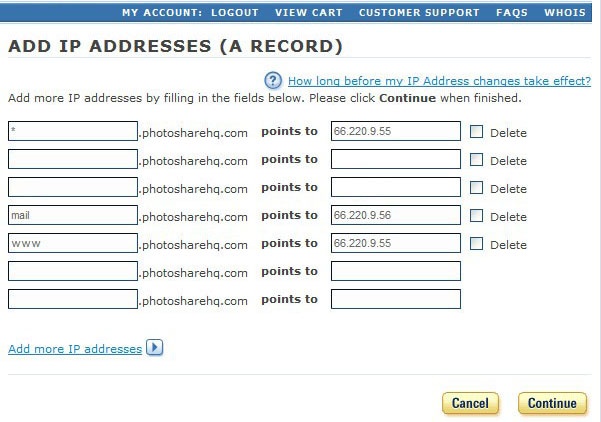 To host you private domain website, you need to add an A-Record of "www" that resolves to 66.220.9.47. After you may make the necessary changes, click Continue to apply them. Click Continue again to confirm the changes. Pleast note it takes about 24hours for a DNS name to be updated on the Internet.