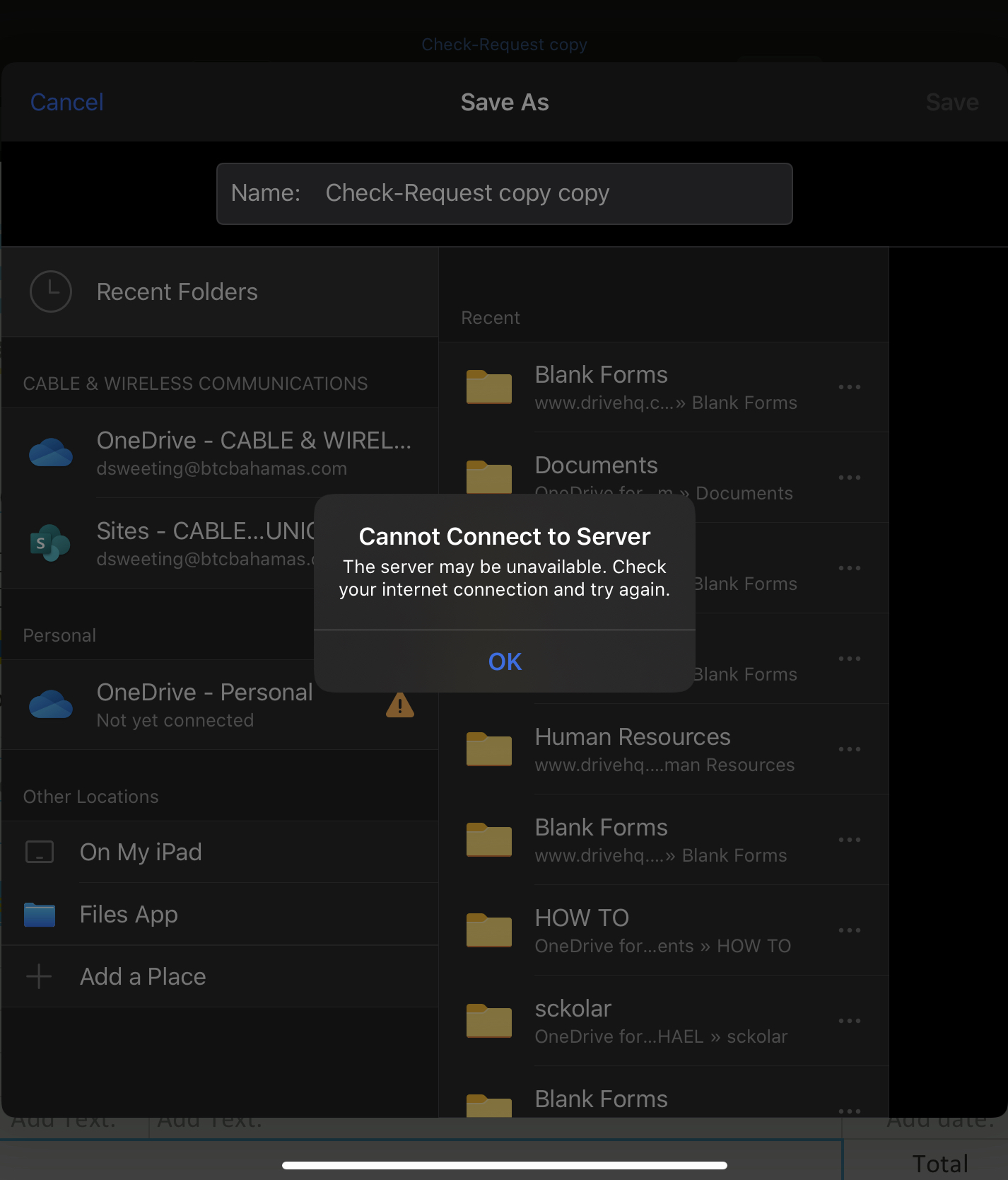 I am unable to save files to DriveHQ server on my iPad. I receive this message. What is the problem?